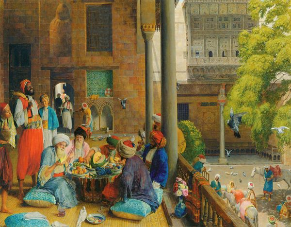 Jehan Georges Vibert painted "At the corrida" using oil on canvas. The composition presents us with a tiered perspective, dividing the scene into distinct planes of observation. Notice how the wooden barriers act as framing devices, segmenting the crowd and drawing our eyes to the individuals within each section. The materiality of the paint application varies across the canvas, with thicker impasto in areas that highlight texture and form, like the draped fabric and wooden structures. In contrast, thinner washes create depth and atmosphere in the background, suggesting the vastness of the crowd. Vibert uses a palette dominated by earthy tones, punctuated by vivid accents of red, white, and blue. The painting reflects broader themes of spectatorship and social hierarchy. The formal arrangement invites us to consider how individuals are positioned and perceived within the social structure, and how the act of observing is itself a form of participation. The use of color and texture reinforces the idea of a vibrant, multifaceted society, each element contributing to the overall spectacle.