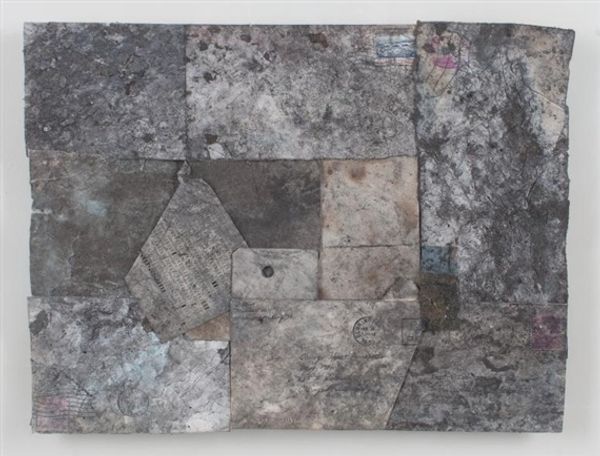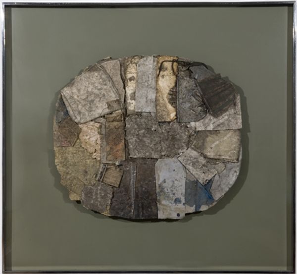 Editor: This is “Not End Titled” by Achill Redo. It's a mixed media piece. The composition is quite striking, but I'm not sure what to make of it. What stands out to you? Curator: The circular form immediately suggests wholeness, but the fragmented materials disrupt that illusion. Consider how Redo, working post-World War II, might be commenting on societal fractures. What histories do these discarded materials carry? Editor: So, it’s less about the beauty of the object and more about the statement? Curator: Precisely. It is about the relationship between the materials, the history and its context within contemporary society. Perhaps it reflects the artist's position in the then current social climate. Editor: Okay, I see it in a completely different light now. Curator: Exactly! Art is about shifting perspectives.