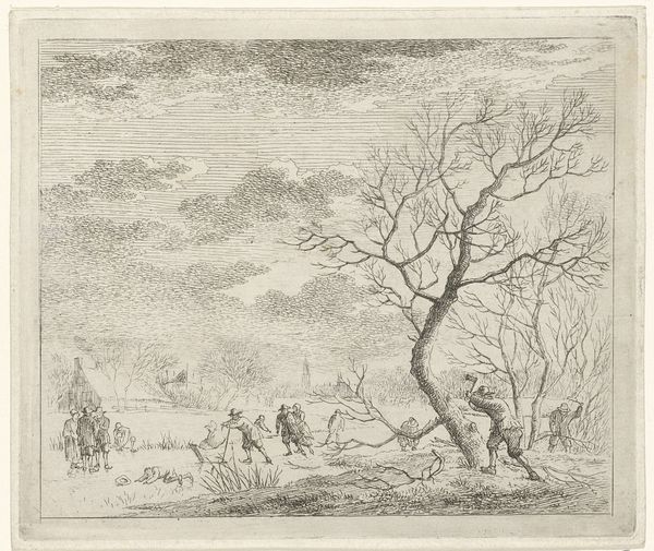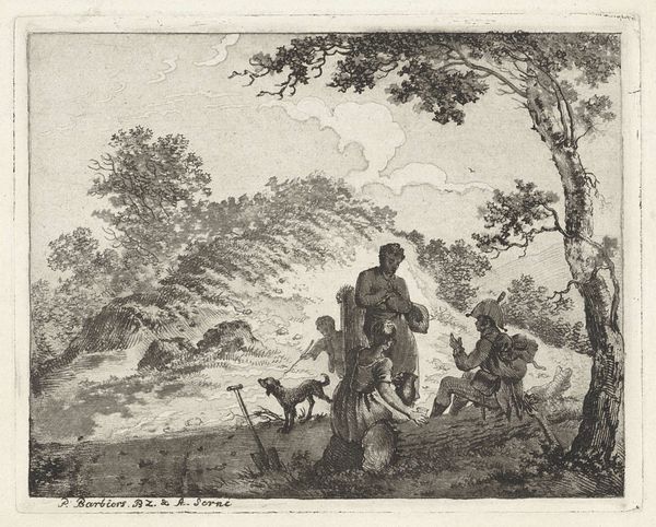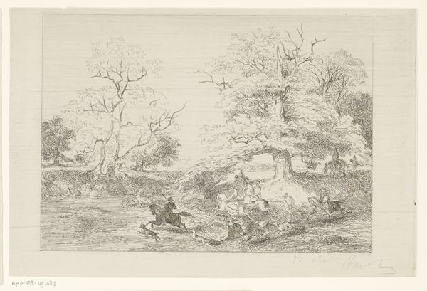 Curator: Before us is "Man en vrouw bij waterval," or "Man and Woman by Waterfall," a pen and paper drawing attributed to Reinierus Albertus Ludovicus baron van Isendoorn à Blois, placing its creation somewhere between 1796 and 1856. The artist captures a quiet encounter near a cascade. Editor: There's a delicate melancholy hanging over the scene. The wispy pen strokes almost veil the figures, as if they are fading into the landscape. The scale is surprisingly intimate, which heightens the feeling of a fleeting, private moment. Curator: Notice the careful orchestration of line. Van Isendoorn à Blois masterfully uses varied densities to suggest depth, particularly in the cascading water and the foliage. The drawing employs layering and hatching that brings an airy feeling to the materiality. Editor: Waterfalls themselves carry immense symbolic weight, don't they? Think of cleansing, the passage of time, the untamed power of nature. I wonder about the narrative here. The woman seems almost withdrawn, while the seated man... is he contemplating? Or merely resting? It suggests an encounter charged with some unspoken feeling. Curator: I am struck by how the negative space functions. The large area of untouched paper behind the figures and above the landscape creates a stark contrast, emphasizing their placement within the composition and the monumentality of the natural forms surrounding them. Editor: Considering its age, one can't help but interpret this scene through a lens of Romanticism. There is that pervasive interest in nature as a mirror for the human soul, its complexities and drama echoed in the untamed wilderness. A simple walk becomes imbued with psychological weight. Curator: Indeed, it's the interplay of the structured lines that give form to nature itself against the human figure that is important. Each contributes equally to the effect of the drawing. Editor: Seeing these enduring symbols anew helps us appreciate the depth of our connection with images across time. Curator: And that is the beautiful construction here of the medium of pen and paper, creating timelessness.