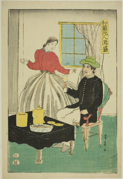 Utagawa Yoshikazu created this woodblock print, "A Dutch Group," around 1860. The print's composition is organized around the figures and objects arranged in a shallow, stage-like space. Predominantly, the color palette consists of muted blues, reds, yellows, and browns, which lend the scene a subdued, almost dreamlike quality. Yoshikazu's formal arrangement and use of color invite us to consider the cross-cultural encounters of the period. In a way, the artist seems to be exploring the exoticism of foreign cultures. The print may be engaging with contemporary discourses surrounding Japan's opening to the West and the resulting cultural exchanges and perceptions. The print's aesthetic appeal resides in its delicate balance between representation and abstraction. By focusing on its formal qualities, we can appreciate how Yoshikazu's work operates within the broader framework of 19th-century Japanese art and its engagement with global cultures.
