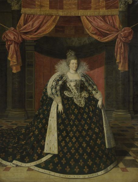 Editor: This is Edwin Landseer's "Queen Victoria and Prince Albert at the Bal Costumé of 12 May 1842," painted in 1842 using oil on textile. It looks like a theatrical depiction of royalty, with incredibly detailed costumes. What strikes you about this piece? Curator: What fascinates me is the material culture on display and the implied labor behind it. The sheer volume of textiles depicted - the velvet drapes, the embroidered gowns – speaks volumes about Victorian industry and global trade networks, right? Editor: So you are less interested in who they are representing, but more about their representation, as in, how these images impacted production methods? Curator: Precisely! Consider the sourcing of materials: where did the dyes for those vibrant fabrics originate? What were the working conditions like for the artisans who crafted them? Landseer’s painting isn't just a portrait; it’s a record of Victorian-era consumption, labor, and power relations. The meticulous detail would necessitate workshops of skilled labourers, all feeding into this singular royal image. Editor: That makes you wonder about the story behind its manufacturing as much as its reception... the global journey and implications tied to something that might seem merely decorative to us at first. Curator: Exactly. Think of the cotton mills fueling the British textile industry or the imperial reach necessary to access luxury goods for these garments. We’re seeing the evidence of exploitation and complex trade routes. How does acknowledging this change our interpretation? Editor: Now it gives the painting an underlying critique of the wealth accumulation depicted here, which the royal subject almost conceals through romanticised escapism. Curator: Indeed, acknowledging the means of production reveals a hidden narrative.