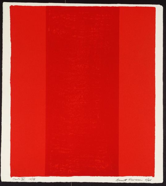 Curator: This is an untitled oil painting by Mark Rothko, created in 1968, towards the end of his career. Editor: Initially, it feels heavy, almost oppressive. The dominance of black is stark, only relieved by that thin, maroon band. It feels like a horizon line weighted down by what's above it. Curator: Rothko was deeply invested in the emotional power of color. This reduction to almost pure black resonates with cultural symbols of mourning and the void. The maroon rectangle disrupts what could be an endless expanse, inviting a focal point but denying easy resolution. Editor: Do you think there is a conscious intention here related to broader societal turmoil? 1968 was, after all, a year of considerable unrest. Could this painting symbolize feelings of despair and struggle during that period? Curator: I think Rothko was grappling with existential themes, his own mortality, for one. I'd lean towards a personal rather than overtly political reading. That dark void, that strip of crimson, almost like dried blood, to me it echoes profound loss. The crimson band acts as a form of catharsis; a hope offering redemption amid loss. Editor: Interesting perspective! While that somber note resounds deeply with Rothko’s well-documented depression, I feel we shouldn't ignore the painting's socio-political backdrop. It’s too easy, in my view, to universalize experiences without grounding them within specific historical contexts. Curator: Agreed. However, the reduction of form here could be interpreted as a turn inwards, towards universal anxieties rather than outward facing social commentary. The image is very open and abstract; a way of conveying something fundamentally felt rather than a defined socio-political condition. Editor: Still, Rothko couldn’t completely isolate himself. Everything filters through experience. Perhaps its power stems from its resonance with individual and collective shadows of that era? Curator: It becomes an exploration of what happens at the edge of legibility; where darkness overwhelms even as that singular burst attempts to cut through it. Editor: Maybe its potency is in that constant tension: the individual struggle within larger systemic struggles. Rothko has made something universally resonant and utterly specific at the same time.