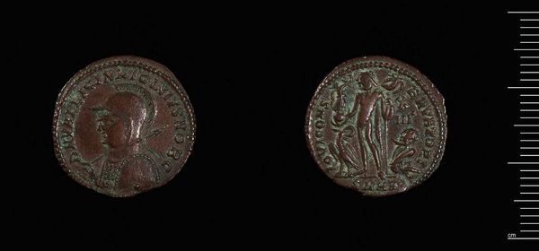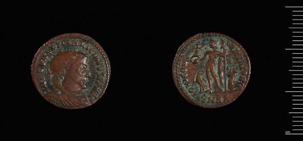 Curator: Here we have a Follis of Licinius I, minted in Alexandria. The use of bronze here really speaks to me. There's an earthy quality to it, don't you think? Editor: It certainly grounds it. Though, I immediately think of the power dynamics at play—the emperor's image stamped onto currency, a literal embodiment of authority. Curator: Indeed. Observe the meticulous detail in rendering Licinius's profile, contrasted with the somewhat more stylized depiction of the deity on the reverse. It's a fascinating study in relief. Editor: And whose story is prioritized here? This isn't just about aesthetic choices. It reflects a deliberate effort to legitimize power through visual propaganda and religious symbolism. Curator: I appreciate how you contextualize the piece. The interplay of image and material offers a compelling glimpse into the construction of imperial authority. Editor: Agreed. It's a potent reminder of how art, even in miniature, can function as a powerful tool for shaping narratives.