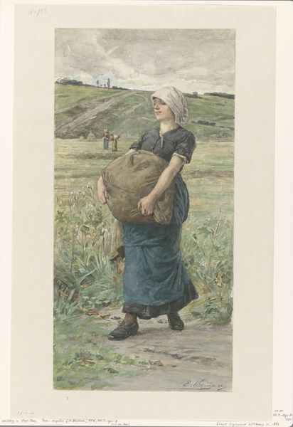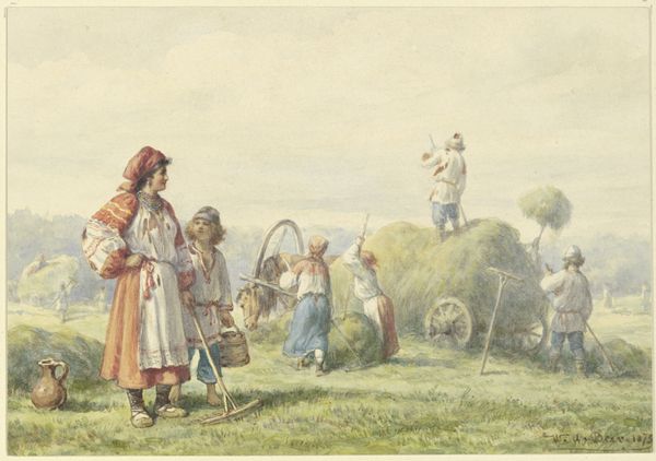 Editor: Here we have Wilhelm Amandus Beer’s “Russische Bauern beim Wasserholen an der Quelle,” painted in 1898, using watercolor on paper. It shows Russian peasants gathering water. It seems to me, at first glance, to depict a scene of communal labor, something almost…idyllic. What do you see in this piece? Curator: I see a very deliberate construction of rural labor. Look at the way Beer renders the buckets, the source. It highlights not just the activity, but the very means of sustenance. What materials were used to create those buckets, who shaped them, and how does that intersect with the social hierarchy of the time? Editor: So, you are suggesting to move beyond just the subject and focus on how it’s produced? Curator: Precisely. Consider also the watercolor technique. Its lightness, its accessibility compared to oil paints – how might that choice of medium reflect Beer’s engagement with Realism and a desire to represent, and perhaps elevate, everyday life? How available was watercolor on paper to Russian artists? Editor: That makes sense. I hadn’t thought about the socioeconomic implications of even the materials chosen. I suppose I was caught up in the apparent simplicity of the scene. Curator: Simplicity is often a crafted illusion. Think about the clothing; spun, dyed, sewn, all forms of labor contributing to the scene. Does Beer idealize the hardship of these peoples’ life, and gloss over social issues and inequality, for an external, western gaze? Or is it an effort to truly document the value of their labor? Editor: So, instead of simply accepting the image at face value, we should consider it a constructed view dependent on social and economic forces… both within the painting and around the artist? Curator: Exactly. It compels us to consider the complexities inherent in depicting any form of labor, to understand its social fabric. Editor: I definitely have a new perspective. Thank you! I now look at art from the perspective of not just *what* it shows, but *how* its made, who made the raw materials, and who it's actually *for.* Curator: And that perspective will continue to reveal more to you with every artwork you encounter.