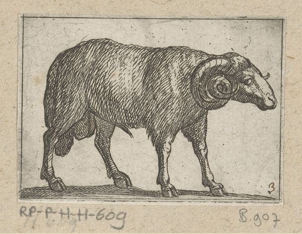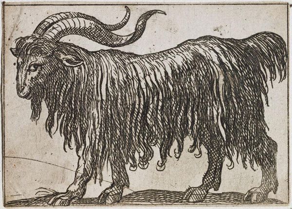 Curator: The texture almost vibrates off the page, a static charge held in the ram’s wool. Editor: Indeed. What we have here is Antonio Tempesta’s “Standing Ram,” currently residing at the Harvard Art Museums. Tempesta, active in the late 16th and early 17th centuries, was known for his detailed and energetic prints. Curator: The ram, especially the male, carried significant weight in Renaissance symbolism, often linked to ideas of virility, strength, and even sacrifice. How does its representation here reflect or subvert those notions, given the printmaking process? Editor: The etching—the acid biting into the metal plate—suggests a collaboration, almost. It's not just Tempesta's hand, but the agency of the materials themselves that dictates the final form. And this particular ram doesn't strike me as overly virile. Curator: Perhaps the ram’s quiet strength, its very ordinariness, challenges the hyper-masculine ideals imposed upon it. It’s not about brute force, but about a grounded, perhaps more nuanced, understanding of power. Editor: So, its power resides not just in its biological destiny, but in its quiet resistance to it. Intriguing. Curator: It offers a space to reconsider how we project meaning onto animals and, by extension, onto each other. Editor: A space etched out, literally, through labor and material, inviting a deeper look. Thank you.