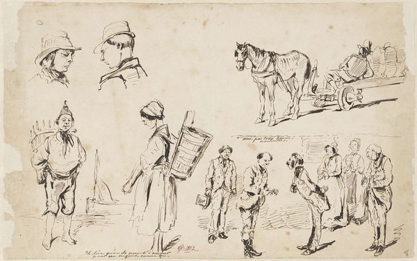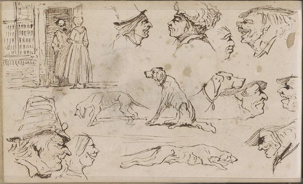 Editor: So, here we have "Dog and Figure Studies," a drawing by Johannes Tavenraat from between 1864 and 1880, using pencil and ink on paper. It gives off this very casual, sketch-book feel... almost like a quick snapshot of everyday life. What social context can we draw from these studies? Curator: Exactly! This "snapshot" wasn't about perfectly rendering reality, but about capturing fleeting moments. Think about the burgeoning industrial revolution during this period. With increasing urbanization and changing social structures, artists became more interested in portraying contemporary life and everyday activities. What do you notice about the people depicted here? Editor: Well, their clothes seem to represent different social classes. I see a woman carrying what looks like a water container on her head, then another figure in a tall hat. Were artists like Tavenraat trying to document the various layers of society? Curator: Precisely. Artists used sketchbooks to study and document the people around them in society. These studies were very functional. How would you say Tavenraat is positioned as the artist, within Dutch society? Editor: Considering that they are drawn in sketch style, I see the figures not as portraits but as quick observations from daily life, from the eyes of an active participant of society, similar to how we use photographs today. The fact that it's in a museum today raises interesting questions about value. Curator: I'm glad you mention that. The art market certainly influences what survives and how it's valued today. Even casual sketches can offer deep insights into the social and economic hierarchies. It allows us to reconsider not just art, but the lens through which it is valued in different political climates. Editor: This was extremely helpful. The discussion about the value of daily records, such as sketches, gives me an entirely new perspective of what museums choose to exhibit and display. Curator: Likewise, it’s insightful to witness art reflecting society back at us, reminding us of our shared yet varied experience.