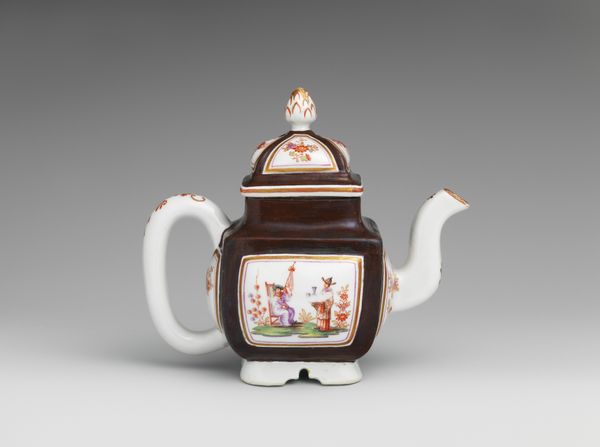 Editor: Here we have a "Teapot and milk jug" from around 1800-1805, made by Koninklijke Porseleinfabriek Dommer & Co. in porcelain. It is beautiful! It makes me think of stories and fairytales. How do you interpret this work and the imagery chosen to decorate such a common object? Curator: What strikes me immediately is the pastoral scene rendered on such a refined object. A humble, everyday landscape finding its place upon something used in the rituals of the upper classes. Consider the landscape itself – it’s a carefully constructed image of leisure. What kind of world do you imagine the owner inhabits, based solely on this decoration? Editor: It is idealized! A relaxed and pleasant world... Perhaps that domestic image signals social aspirations for the person who used it, connecting them to nature, perhaps? Curator: Precisely! Images like these speak to cultural memory. A specific notion of countryside life gets fixed to porcelain and passes to us. See how the colours – the greens and browns of the landscape, combined with the gilt trim – add an element of restrained luxury? Porcelain itself became a symbol, remember: the secret of making it guarded jealously in Europe. This is not mere decoration. The act of drinking tea, using porcelain ware became enmeshed with social meaning, rituals and political ideas. What feelings does this kind of idealized scenery evoke in you? Editor: A bit of longing, perhaps? It presents an attractive fantasy. I think I now better grasp how imagery influences how we remember a certain place, and how the decoration becomes so important in reading the history of objects like this one. Curator: Indeed, the convergence of material, imagery and function is powerful. It demonstrates how deeply intertwined art, everyday life and historical perception are.