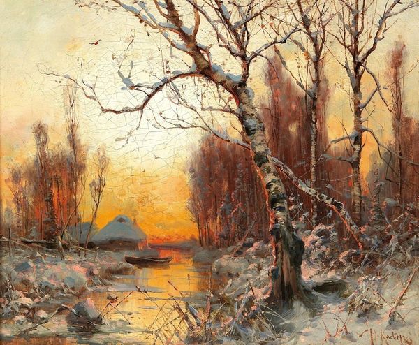 Editor: Here we have Julius Sergius Klever's "Winter in Russia" from 1912, an oil painting depicting a snow-laden landscape. I'm immediately struck by how...hushed it feels. What draws your eye when you look at this piece? Curator: Hush indeed! For me, it's like stumbling into a memory, or perhaps a half-remembered dream. See how the skeletal trees reach up like ghostly fingers? And the way the light seems to bleed from the sky rather than shine? Klever's not just painting a winter scene; he's capturing the *feeling* of winter, that sense of solitude and quiet contemplation. Editor: That's interesting! I was also noticing the realism of the trees, it really puts you into the bleak landscape. Curator: It’s like you can feel the cold biting at your cheeks, isn't it? Now, observe the lone figure trudging along the path. She’s dwarfed by the landscape. Ask yourself, where is she going, what awaits her? Maybe she knows something we don’t, perhaps she is closer to an inner kind of warmth despite of all the outside frost. Editor: Wow, that perspective adds a whole other layer to it. It makes it feel like more than just a landscape, more like a story waiting to unfold. I appreciate how it balances that bleakness with the potential for human connection or survival. Curator: Exactly! It's that tension that makes the painting so compelling. You see, art isn't just about pretty pictures. It's about tapping into something deeper, stirring up emotions, and sparking questions within us. Don’t you agree? Editor: I absolutely agree. This has really opened my eyes to looking beyond the surface. Curator: Then my friend, you've begun to truly *see*. And that, my dear editor, is where the magic of art resides.