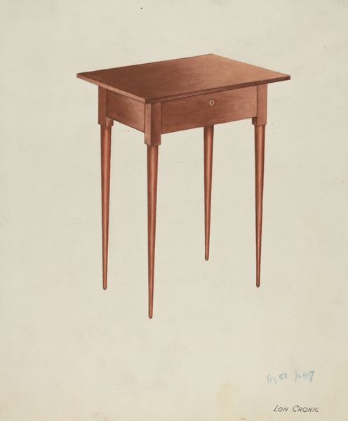Curator: We're looking at "Dining Room Table," a watercolor drawing on paper made around 1936 by Howard Weld. Editor: My first thought is domestic tranquility. There’s a stillness in this simple, elegant form. It feels so contained and proper. Curator: It does. You have to remember, at this time, this kind of imagery served a very specific function. These weren't artworks in the conventional sense, made for display; these images documented American design during the Depression. Editor: So, it’s a kind of portrait, right? It freezes the social history of the table in time: daily routines, mealtimes, family gatherings... I wonder what kinds of conversations and stories this particular table would have witnessed? Curator: Absolutely! The table also carries certain iconographic baggage. Notice the twist detail of the table legs, and the hardware detail? I read it as symbolic of home, labor, family, roots. Editor: Those details do add another layer. In a way, this isn't just about one dining room table; it’s a generalized symbol for an entire aspirational lifestyle. The rendering emphasizes a kind of attainable ideal—practical, but possessing a delicate sophistication. Curator: Right, a hopeful projection during hard times, almost like a visual mantra. It projects this notion of home and rootedness at a time of economic precariousness. Editor: And it highlights the beauty that can be found even in simplicity, in everyday objects. It speaks volumes by saying very little. I initially found this quiet image appealing on a formal level. But seeing how this one table signifies security and endurance certainly deepens its impact. Curator: Exactly! It prompts me to reflect on how we ourselves interact with mundane items as placeholders of memories, longings and yearnings. Editor: Me, too. Thanks for helping me see more to this than a pleasant table in watercolor.