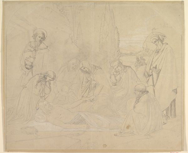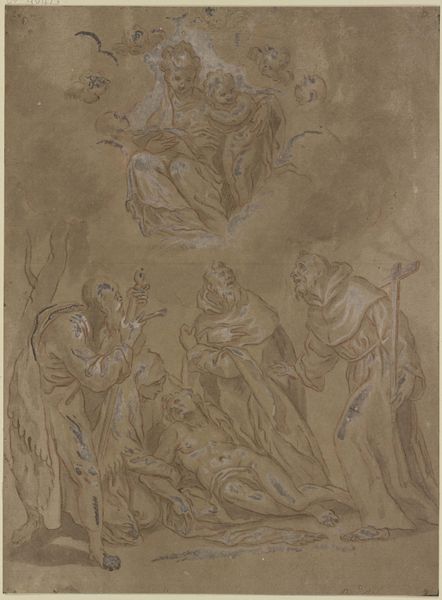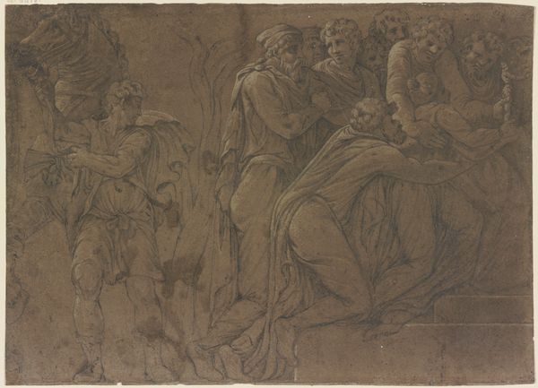 Curator: What strikes me immediately is the pervasive sense of muted solemnity. The sepia tones lend it an air of antiquity, and the composition seems carefully constructed, perhaps referencing classical friezes. Editor: Indeed. This is a drawing by Polidoro da Caravaggio, dating to 1656. It’s titled "Der verlorene Niobidenfries an der Fassade des Palazzo Milesi in Rom" and is currently held at the Städel Museum. Curator: Fascinating. Looking at the layering of forms, I note a certain dynamic tension between the individual figures and the unified whole. Polidoro clearly emphasizes classical form and proportion, adhering to a tradition where the interplay of lines creates spatial depth. Editor: Precisely. And what's intriguing from a material perspective is Polidoro's use of ink on paper, specifically, the choice to employ primarily Indian ink. Consider how that informs the historical and practical constraints, for one it influences its preservational integrity; Polidoro could only get so much saturation of darks on his tonality. This would certainly speak to the fresco process on site where this drawing may be only one aspect of design on this project. Curator: That's insightful. The gradations achieved are masterful, suggesting perhaps a symbolic interplay of light and shadow, echoing the high-renaissance and early baroque periods of figuration within which it falls. Editor: Furthermore, the condition and materiality point to the circumstances of its making; it presents the relationship between labor and capital within the baroque era’s architecture and production processes. These lost murals only survive as this study, what can this tell us about what has value and what can be discarded in our cultural memories? Curator: A vital point. It is precisely this duality, isn't it? It captures both grand narratives and fragile, individual narratives of materiality and execution of labor simultaneously. Editor: Perhaps in the end, through understanding his technique, we see this not merely as documentation but a tangible reminder of the cultural machinery within society at large. Curator: Absolutely. Studying the aesthetic form unveils a glimpse into the cultural memory itself. Editor: And conversely, by focusing on material applications and social implications we might broaden the horizon through a simple, monochromatic, and historical frieze.