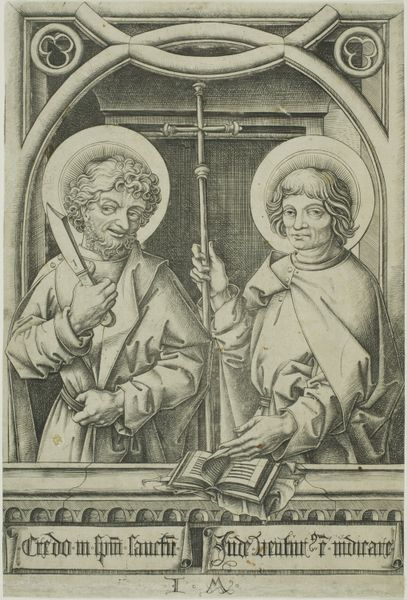 Israhel van Meckenem created this engraving, Petrus en Andreas, during the late 15th century, a period defined by the rise of humanism and shifting religious landscapes. Van Meckenem, a prolific printmaker in Germany, reflects in this piece the complex interplay between religious devotion and artistic expression. The figures of Saint Peter, holding his emblematic keys, and Saint Andrew, with the saltire cross, are rendered with a detailed realism that invites a personal connection. The choice of these two saints, both central to the early Christian church, speaks to the era's focus on foundational religious figures. The inscription at the bottom, "Credo in unum Deum," meaning "I believe in one God," reinforces the theme of unified faith. Van Meckenem does not dramatically depart from traditional iconography. Instead, he infuses the image with an emotional depth that reflects the personal piety of the time. The expressions on the saints’ faces suggest contemplation and a profound connection to their spiritual roles. This work serves as a testament to the enduring power of faith, rendered through the skilled hand of a master printmaker.
