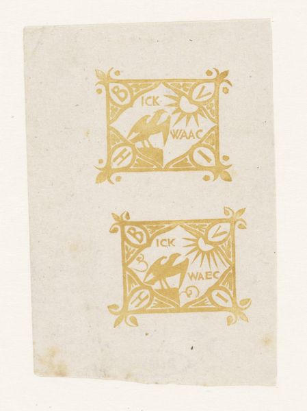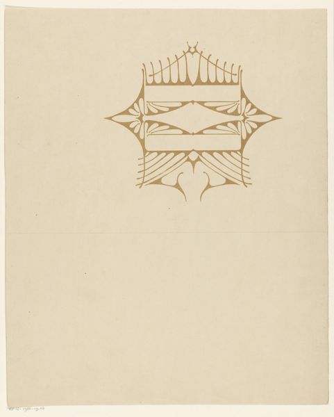 Curator: This delicate drawing is simply titled, "Ornament." It's attributed to Reinier Willem Petrus de Vries and was created sometime between 1884 and 1952, showcasing a simple elegance on aged paper. Editor: My first impression is how intentionally spare it feels, as if the artist knew exactly how much was needed to create balance. The bare paper becomes an active element. Curator: Exactly. Vries uses light pencil work to create a personal sketchbook design, suggestive of Art Nouveau. Notice the hand-drawn type aesthetic and the careful geometry that underpin what at first glance may seem merely decorative. I’m also intrigued by the symbolism inherent in ornamentation itself. What deeper meanings might be embedded within this? Editor: The function, perhaps, gives us a clue. As a potential title page for a journal, its delicate frame invites a sense of intimacy and reflection. The cultural role of such personal objects tells us something about the value placed on privacy and self-expression during the period. Were journals commonplace? How were they perceived in wider society? Curator: It's interesting you mention journals, because sketchbooks have historically been a realm for the unsaid, for the germination of ideas— a private space for the artist. The symmetrical balance almost suggests a mirror, furthering this invitation to self-reflection. This work reveals the artist's own visual language, a lexicon of recurring shapes and motifs, if we were to look deeper in other sketchbooks. Editor: It brings to mind questions about access, too. The preciousness of materials—homemade paper and specialized drawing implements—speaks to a level of economic privilege, perhaps indicating the socio-economic status of those who kept journals at the time. These everyday artifacts open up broader questions of social history. Curator: I agree. It's easy to overlook such understated pieces, but in their quiet way they whisper about the inner life of individuals and eras. The drawing reminds us to consider the emotional significance of everyday objects and their subtle but lasting cultural weight. Editor: It highlights how what appears on the surface as a minor artwork contributes to the broader cultural narrative and challenges us to consider the politics of representation in even the most humble of designs.
