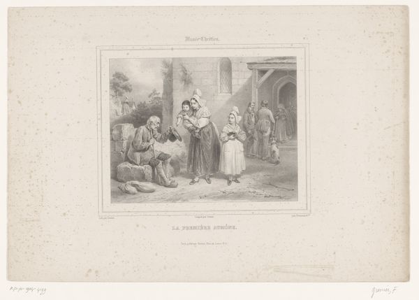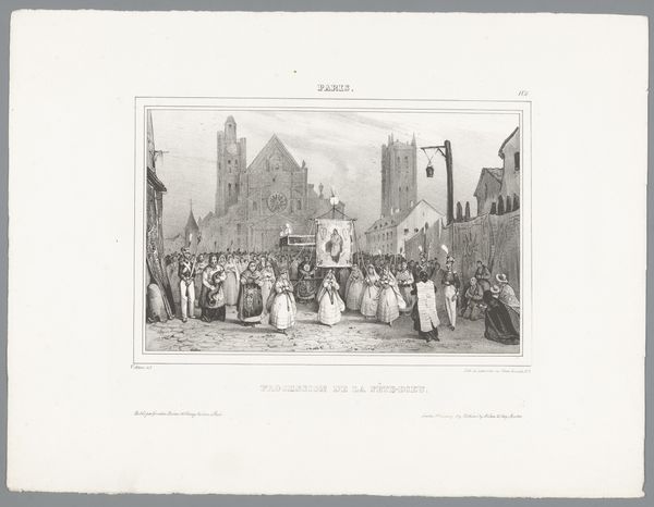 Curator: Ah, here we have Victor Adam’s "Grande Allée van de Tuilerieën," dating back to 1829. It’s a print, an engraving capturing a slice of Parisian life, now residing here at the Rijksmuseum. Editor: My initial thought? An incredibly bustling day! The scene has this almost… stage-like quality. Is it the figures posed just so, or the way the light etches out all of them, throwing long shadows to bring us, the viewers, in? Curator: I’m struck by the meticulous detail in this genre painting. Look at the orchestration of figures, almost theatrical in their arrangement. The trees frame the scene, lending a depth that pulls the eye through the allée. Editor: Yes, a depth achieved so smartly by playing with scale—foreground figures large and lively, receding towards the distant architectural backdrop! The clothing is wonderful, too: stiff collars, patterned dresses; a study of sartorial intent in that particular moment in time. All framed by nature! It almost says, ‘Nature frames humankind as humankind frames itself’ ... a lovely little allegory. Curator: Indeed, the contrasts intrigue—the rigid formality of attire against the somewhat free-flowing boulevard. Semiotically, you have clear indicators of status: clothes denoting class, groupings suggesting social strata all intertwined, each seemingly performing their part in the play. Editor: The perspective has a peculiar flatness, as if space is collapsing forward—flattening the aristocracy along with it, even. You know, if the eye travels up from those two chatting under that central tree to that building—which looks so, SO like the tower in Sleeping Beauty—I would feel like time is folding on itself: all things becoming, well… romantic! Curator: A keen observation—perhaps Adam hoped to reveal through these vignettes an enduring quality, a romantic ideal of Paris even amid the everyday. I appreciate the layered complexities he has managed to imbue with such deceptively simple tools. Editor: It is like stumbling upon a tableau vivant. But thank goodness it's more permanent, as an imprint on time we can consider whenever the mood for history strikes.