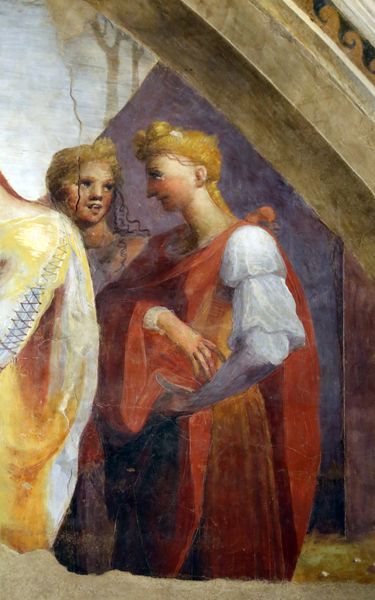 This is a fresco from the Rinuccini Chapel in the Basilica of Santa Croce, by Giovanni da Milano. Observe the delicate use of color and the figures’ slender, elongated forms. These elements contribute to a sense of ethereal beauty and refined elegance. The composition is carefully structured, employing vertical lines of the figures and architectural elements to create a balanced yet dynamic arrangement. The soft color palette, dominated by pastel blues, creams, and muted reds, enhances the fresco's gentle and harmonious quality. This piece reflects a departure from earlier Gothic styles, embracing a more naturalistic representation of the human form. Giovanni da Milano's work here embodies a transitional phase in art history, moving towards the Renaissance’s emphasis on realism and humanism, all while maintaining a connection to the spiritual and decorative values of the preceding era. The artist’s precise detail and structural balance reflect the ongoing evolution of artistic expression.