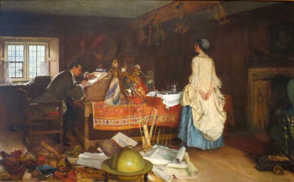 Editor: This is "Group of Women Looking at Stereoscope Photographs," made before 1868 by Jacob Spoel. It looks like an ordinary scene, maybe some women enjoying each other's company in a domestic space... But what’s interesting to you about this painting? Curator: It is precisely the idea of an ‘ordinary scene’ that I find so compelling. On the surface, it's a glimpse into domesticity, but look closer. Who has access to such leisure? These women, engaged with this new technology, the stereoscope, hint at a burgeoning middle class and their changing roles within society. Do you notice how they are clustered, sharing the experience? Editor: I see it now, there's almost a sense of community here. They're not isolated in their enjoyment; they're sharing a new way of seeing the world together. Curator: Exactly. The stereoscope itself becomes a symbol. Consider who had access to these images. What narratives were being consumed? The women’s gazes and posture suggests this new technology gave women an agency to engage with ideas beyond the domestic walls that, prior, confined their interactions within strict limits and power dynamics. It enabled connection on an unprecedented level. Editor: That's a point that had eluded me completely, but it makes perfect sense! It speaks to women claiming a space in intellectual life through something as seemingly simple as viewing photographs. Curator: It encourages us to question how visual media can either reinforce existing power structures or provide platforms for challenging them. Looking at the context through the lens of feminism adds so many extra layers of historical relevance to an initially seemingly plain artwork. Editor: I am walking away from it seeing the piece with whole new eyes! Thanks.