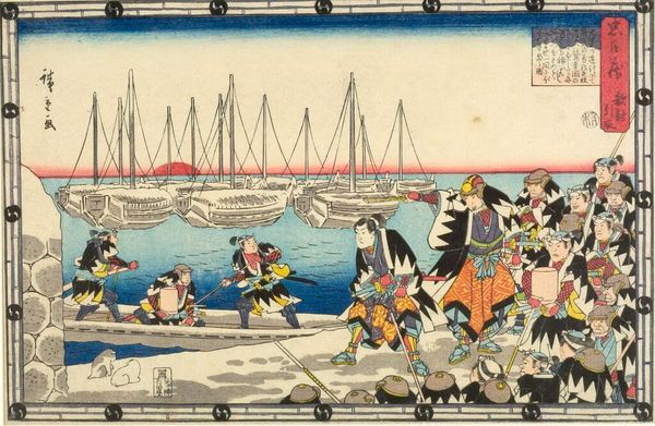 Editor: We’re looking at “Delivering the Enemy,” a woodblock print in ink by Utagawa Hiroshige, dating to sometime between 1843 and 1847. It’s incredibly dynamic, a crowded scene filled with figures. What strikes you about the composition of this print? Curator: Note the rigid frame that constrains the interior image. The action unfolds, yet it's within these constructed boundaries, where formalism dictates. Consider the layering. See the receding planes, one upon the other. Horizon, harbor, foreground: a sequence carefully calibrated to define spatial relationships and graphic rhythms. Editor: I see how the frame almost acts like a stage. Can you talk more about the figures and what's happening in the foreground? Curator: These are the protagonists in action. A controlled violence, if you will. Notice the color usage and strategic placement, how the patterns in their garments command a kinetic interplay. Hiroshige emphasizes movement through calculated asymmetry, an intricate yet precise method. Look at the angular positioning of each character. The repetition is crucial here. Do you notice a kind of structured chaos? Editor: Absolutely, especially in the men's clothing on the right, the pattern feels dense but organized. And those small dogs at the bottom-left seem intentionally placed amidst the scene. What should a visitor be sure to observe here? Curator: Notice the texture achieved through the layering of the woodblock prints; examine how form and content depend on the medium, its materiality as a support for meaning. Appreciate, finally, how through structural repetition and variance, that is, through tension and balance, a deeper order emerges. Editor: This focused, intense way of looking really allows us to delve into Hiroshige's intent. Thanks so much for sharing your perspective. Curator: Indeed. Attentiveness to visual form gives us pathways toward appreciating both artistry and design, where careful semiotics, structure, and a basic form of philosophy guide our eyes.