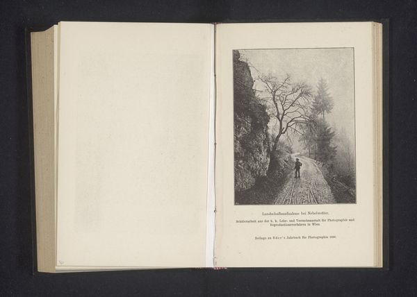 Curator: This serene photograph, taken before 1892, is titled "Gezicht op een pad door een gebied met rotsen," or "View of a Path Through a Rocky Area" by M.P. du Montal. Editor: It has the crisp air of autumn, doesn't it? The way the bare trees reach for the sky amidst those stony giants gives the image such a solitary feel. Curator: Indeed. Looking at the albumen print itself, you can see how carefully crafted this landscape is, considering its materiality. The process demands an intense connection between the artist, chemistry, and environment, which is interesting here since nature itself is the subject. Editor: You know, albumen prints are so compelling because they use egg whites, which is just… strange to think about now, isn’t it? It lends this fragile luminosity to the stark scene; I love that contrast. Almost dreamlike in its texture, as if this isn’t exactly…real. Curator: I wonder about Montal’s specific intent here, the choice of focusing on a path; perhaps it suggests journey, both literally and figuratively, through life's rocky terrain. Editor: Or, more literally, perhaps the development and popularizing of road infrastructure being seen in terms of material advancement… This is labor captured, commodified! And look how beautifully composed – that central road that really structures this picturesque composition. It leads to… nowhere in particular? Curator: It certainly invites you to ponder where this road will take you; maybe somewhere quiet, a moment for inner peace, away from roads themselves. It also has an allegorical resonance with the path an artist carves in a world changing under their hands, an intimate invitation for a kind of metaphysical communion. Editor: Well said! Now that I’ve thought about it for a minute, it makes me see all sorts of potential. I still see capitalistic material progress, and an infrastructure investment boom! Curator: Whatever our individual journeys with it, hopefully we find a new path to understanding our role in it. Editor: Yes, an object made of capital itself opens a doorway! How interesting, when you put it that way!