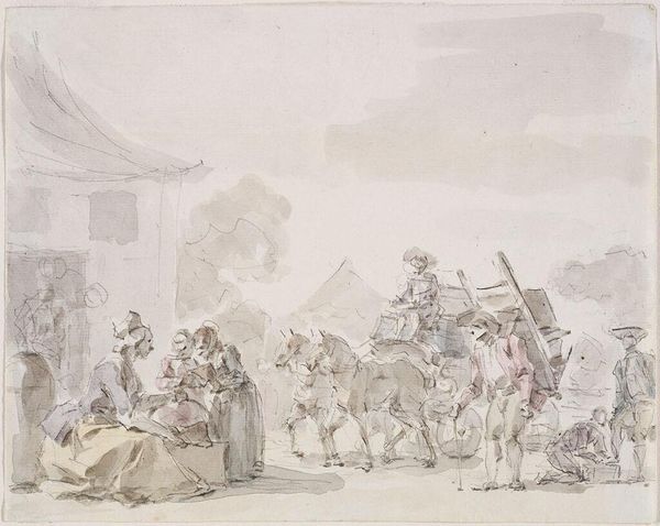 Denijs van Alsloot created this ‘Street Scene’ with pen and brown ink, and watercolor. Observe the figures in the foreground, particularly the couples strolling arm in arm. This motif speaks to a larger cultural narrative of unity and partnership, echoing in wedding portraits of the era and even in classical depictions of concordia. Consider how such a gesture transcends mere physical support; it signifies a bond, a silent agreement of mutual reliance. We see hints of this in ancient Roman sarcophagi, where spouses are depicted with clasped hands, a symbol of eternal commitment that persists even in death. The act of linking arms also carries an emotional weight. It is a public declaration of intimacy and belonging that resonates across time and cultures, suggesting a shared path forward. It has been seen to resurface throughout history in varying contexts, yet its underlying message remains, a testament to the enduring human desire for connection and solidarity.