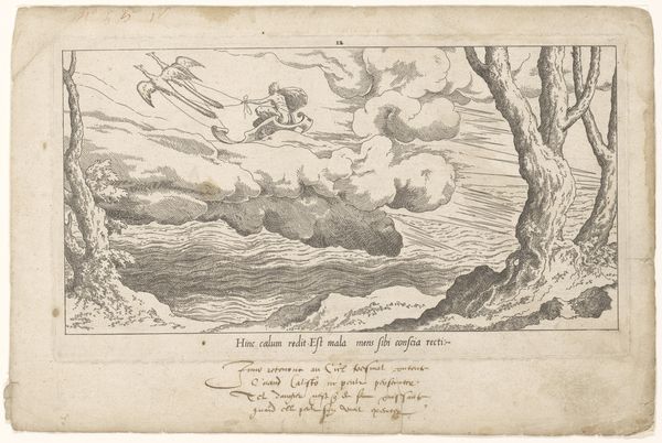 Léon Davent created this engraving, "Olympische goden bewonderen het nieuwe sterrenbeeld", circa 1540-1556. Immediately, your eye is drawn to the Olympian gods arranged across a cloud bank that dominates the upper third of the scene. The contrast between the defined figures and the soft clouds creates a sense of dynamism. Davent uses line and form to establish a hierarchy and to tell a story. Notice how the radiating lines emanating from the sun draw your eye to the gods, but also serve to visually connect the celestial and terrestrial realms. The landscape below, meticulously etched, provides a stage for the divine drama unfolding above. Davent seems to suggest a harmonious interplay between the cosmos and the earthly. But the linear perspective employed is not quite right and destabilises any clear reading. This misalignment may reflect the changing philosophical landscape of the Renaissance as old world views are challenged. The artwork doesn't present fixed meanings, but an ongoing dialogue between classical myth and emerging scientific thought.