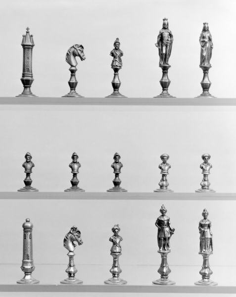 These chessmen were crafted by the E. G. Zimmerman Company in Hanau, their creation marked by intricate detail and a playful approach to form. The set is organized into rows, where each piece features a unique animal figure elevated on a pedestal. The monochromatic color scheme, combined with the varying heights of the pieces, creates a structured yet whimsical visual rhythm. The chessmen present a fascinating interplay between the functional and the symbolic. Each animal form, meticulously sculpted, destabilizes the traditional chess piece, imbuing the game with a sense of narrative. This infusion of character challenges the fixed roles typically assigned in chess. It invites us to consider how these new forms challenge established ideas of power and representation. Ultimately, the texture and sculptural form of these chessmen function not merely as aesthetic choices. They open up dialogues about art's ability to transform familiar structures into arenas of imagination and reinterpretation.