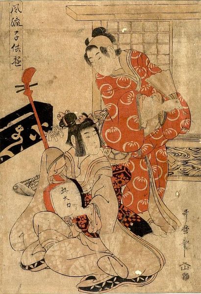 Curator: This woodblock print, attributed to Torii Kiyohiro, depicts Actors Bando Hikosaburo and Matsumoto Koshiro II as the Soga Brothers. Notice the roosters held by each figure. Editor: The roosters immediately strike me. They're held almost like sacred objects, imbuing the scene with a ceremonial gravity despite its theatrical nature. Curator: Indeed, the rooster is a loaded symbol in Japanese culture, representing courage, vigilance, and even divination. Here, they allude to the Soga brothers’ legendary quest for revenge. Editor: It’s interesting how the actors are almost posing with these animals. They’re both part of the drama, but also slightly detached, hinting at the constructed nature of performance and identity. Curator: Absolutely. These prints were immensely popular, allowing audiences to connect with their favorite actors while also engaging with powerful narratives and their symbolic underpinnings. Editor: It’s a beautiful dance between artifice and archetype, isn’t it? Something to really crow about.