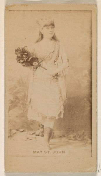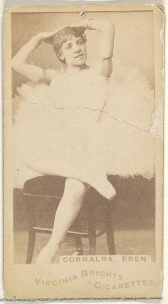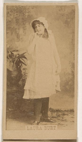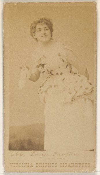 Editor: Here we have "Card 297, Lotta, from the Actors and Actresses series (N45, Type 1) for Virginia Brights Cigarettes," created sometime between 1885 and 1891 by Allen & Ginter. It's a small print, almost like a snapshot from another time, sepia-toned and slightly faded. There's something so innocent yet captivating about the subject's gaze. What strikes you when you look at this? Curator: Oh, my dear, it whispers stories, doesn’t it? Like a half-remembered dream. This little card is more than just advertising; it's a portal! Can't you just smell the old tobacco mingling with a hint of rosewater, the scent of a Victorian theatre dressing room? She's ethereal, our Lotta, like she might vanish if we blinked. The soft lines of the print...do you think it aimed for that Pre-Raphaelite romanticism, elevating an actress to a muse? It is a staged moment, but perhaps also reaching for some feeling of fleeting realness? Editor: I hadn't considered the Pre-Raphaelite connection, that's insightful. It makes sense, given the period. But advertising featuring figures from the performing arts felt so forward at the time! Curator: Exactly! Talk about celebrity endorsements! Now, tell me, doesn't the wear and tear on the paper add a layer of profound meaning? It reminds me that art – and fame itself – is fleeting. How marvelous to consider all of the journeys that little piece of card took over time and space before landing in a museum? And to think, all this power, from something that once came free with a packet of cigarettes. It is as funny as it is gorgeous! Editor: It really reframes the way I see these types of "everyday" objects. Thank you. Curator: My pleasure! To look closer is always to understand more; it invites our souls to bloom, wouldn't you agree?