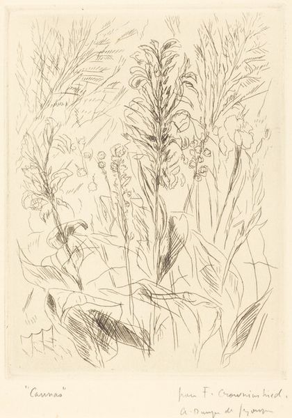 Andre Dunoyer de Segonzac made this etching, titled Fuchsias, with ink on paper. It's all about the line, isn’t it? You can see how Segonzac allowed the fluidity of the line to dictate the form of the plants, the stems bending ever so slightly. Look how the cross-hatching creates volume, like the rounded pots or the dark shadows in the background. The flowers themselves are delicate, almost shy, peeking out from the foliage. It’s interesting how the plant stems are so prominent, holding up the delicate flower heads, the weight of the world on their shoulders. It’s almost as if Segonzac is saying something about nature's quiet strength. This reminds me a little of Matisse's line drawings – that same sense of capturing the essence of something with the fewest possible marks. It’s like a dance, a conversation between the artist and the subject, always moving, never settling. And that's the beauty of art, isn't it?
