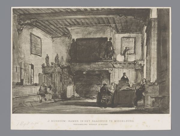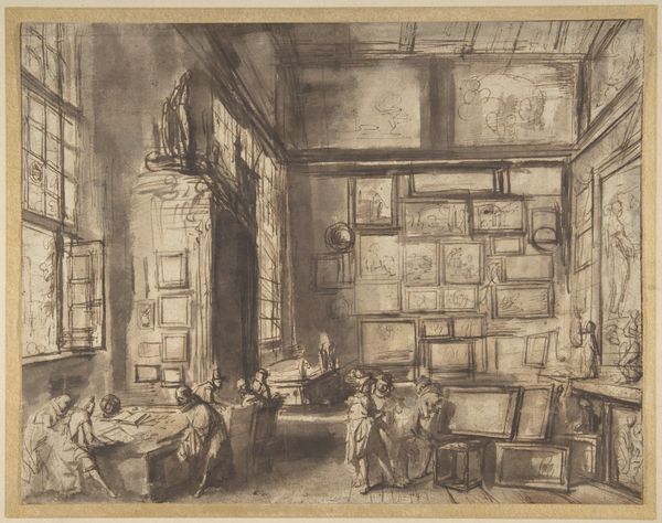 Curator: Good morning. We're standing before Johannes Bosboom's watercolor, "Interieur van de Oude Kerk te Maasland," likely completed sometime between 1827 and 1891. Editor: The muted palette gives it a contemplative, almost sepia-toned feel. It’s quite effective in capturing the church's solemn atmosphere. Curator: Indeed. Bosboom was fascinated with church interiors; their architecture provided a ready-made stage to observe and render the effects of light and space. The focus on the construction, the wooden beams and pews, suggests a careful study of craftsmanship. Notice the deliberate attention to the building's skeleton. Editor: And those details speak volumes about societal structure. Look at how the congregation is arranged in those box pews – enclosed, ranked. The visual hierarchy reinforces the community's social order. Even the chandeliers are meaningful, signifying wealth and status within the church. Curator: Certainly, access to material comforts was far from universal, and this setting underscores that reality. Furthermore, the act of creating this image itself – using watercolor on paper – speaks to the evolving relationship between artistic practice and societal expectations. Editor: It makes you consider the tradition of spiritual symbolism being carried forward into impressionistic artistic representation. The way the light filters in almost feels divinely inspired, but translated into a very grounded, real-world aesthetic. Curator: I think that capturing of light through watercolour reveals its qualities, how it travels through the space, reflects off surfaces, interacts with the wood. This rendering requires observation of the qualities of this location: The daily wear and tear, the human interaction with the space. Editor: It does, doesn't it? And it's so palpable in the architecture rendered here. Well, thank you for giving us a fresh way to experience Bosboom’s interior view. Curator: The pleasure was all mine. Looking at the materials tells me just as much about social dynamics, wouldn't you agree?