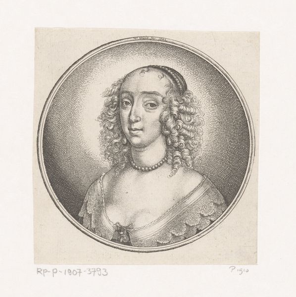 Editor: This is "Vrouw in met bont afgezet kort jakje," or "Woman in a fur-trimmed short jacket," an engraving by Wenceslaus Hollar, dating back to 1645. It strikes me as quite a formal, almost austere portrait, but her curly hair adds a touch of softness. What stands out to you in this work? Curator: Oh, it whispers stories, doesn’t it? For me, the delicate hatching that defines her face feels like a tender caress. There's a subtle tension between the sharp lines of her fur-trimmed jacket, which speak of status, and the almost vulnerable expression in her eyes. Do you notice the almost imperceptible downturn of her lips? It suggests a hidden depth. Editor: Yes, I see what you mean! The fur trim is clearly a sign of wealth, but that hint of sadness complicates the reading. Do you think this was a commissioned portrait, or something more personal? Curator: Ah, the million-dollar question! Hollar was a prolific printmaker, and often created portraits. This was very likely made on commission. But perhaps he saw something in her, something that resonated. Perhaps she reminded him of someone? After all, an artist always leaves a bit of himself in the work, like a fingerprint on the soul. Don't you think so? Editor: I've never thought of it that way before; an artist's fingerprint. That's beautifully put. I suppose there's a story to be told, whether commissioned or not, that goes far beyond just depicting appearance. Curator: Exactly! It’s like the artwork invites us into a world we could have never imagined. And who knows, maybe there is something very imaginative there! Editor: Well, that’s definitely given me a new perspective. I am going to start paying attention to lips more in Baroque portraits. Curator: Ha! May they always tell you interesting tales!