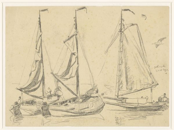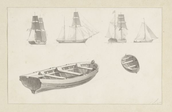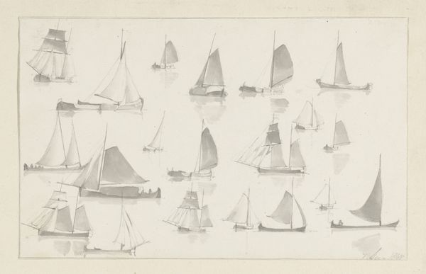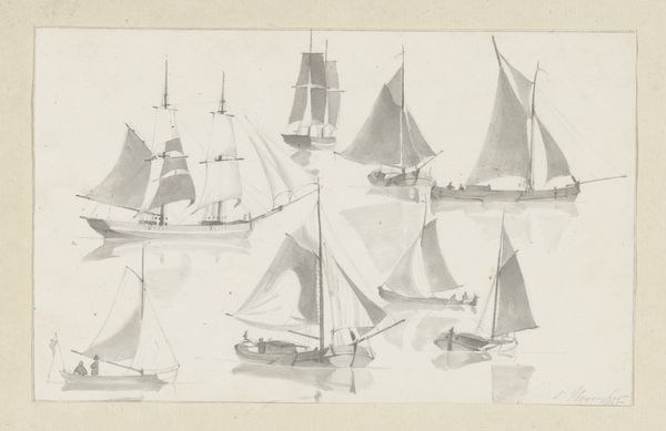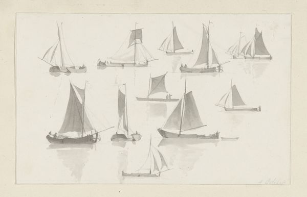 Hendrik Abraham Klinkhamer created this sketch sheet with five sailboats using pen in gray ink and brush in gray on paper. The immediate impression is one of repetition and variation. Five vessels occupy the page, each distinct yet unified by the artist’s chosen medium and style. The varying shapes of the sails, meticulously rendered, create a rhythmic visual pattern against the blank page. The artist's light touch and use of gray ink lends the image a sense of transience, as if capturing a fleeting moment on water. Klinkhamer’s work reflects a broader artistic interest in maritime subjects, but it invites us to consider the underlying structures of representation. Is this merely a study of form, or does it probe the dynamics of movement, trade, and the human relationship with nature? It underscores the interplay between objective observation and subjective interpretation. The choice of monochrome further abstracts the scene, focusing attention on the forms themselves. These sailboats, through the precise application of line and tone, transcend their literal representation, becoming symbols of exploration, commerce, and perhaps, the intangible allure of the sea.