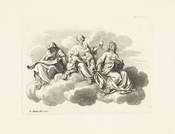 Curator: This print, currently housed at the Rijksmuseum, is titled "Vignet met de familiewapens van Van Baerdwyck en mogelijk Rombout". It’s an engraving done by Reinier Vinkeles sometime between 1751 and 1816. Editor: It has a dreamy, almost ethereal quality. The fine lines of the engraving give it a lightness that contrasts with the serious subject matter of family crests. It feels poised between eras. Curator: Absolutely, and that tension is interesting to me. Looking through a feminist lens, I'm drawn to the female figure presiding over the crest. Is she simply an allegorical figure, or is she a symbol of the family's matriarchal power, subtly shaping their identity and narrative? Considering art history, her garb very specifically speaks to classical female presentation in artwork as symbolic of a figure who can 'bear' the weight and status assigned by the crest. Editor: That’s a fascinating point. The classical allegorical figures, the cherubic figure with the trumpet…these were common tropes of the time, representing virtue, fame, or divine favor. The family would have used an image such as this for their correspondence, bookplates or formal displays of status and family. It speaks to a desire to align their family narrative with historical power. How would you explore the symbolic construction and meaning-making beyond simple historical record? Curator: Well, what about the figures flanking either side of the central crest and figure? On the right we have monstrous and bestial caricatures, that introduce some dissonance to what otherwise might read as uncritical hagiography. Are these critical perspectives added in for wit, or some darker impulse? Do they symbolize enemies overcome or internal struggles within the families represented? What impact might something such as institutional politics, personal family dynamics, or other cultural issues play in these considerations? Editor: Right, that's critical because by examining its historical moment, and those details, we understand this image functioned as a visual representation of power, lineage and aspiration. To own an image such as this communicated wealth, education, taste, all wrapped into these symbols. Curator: The politics embedded in family crests often elide crucial details, specifically through historical vantage point; and focusing too intently on the literal runs the risk of missing its performative nature. But, by engaging the context of class and gender representation, and bringing critical awareness to otherwise commonplace depictions, we open broader perspectives. Editor: Yes, I’d agree; and for me, contextualizing it within its historical and cultural moment unlocks layers of meaning. It's more than just an attractive, formal engraving, but an embodiment of the social values, and often the contradictions, of its time.