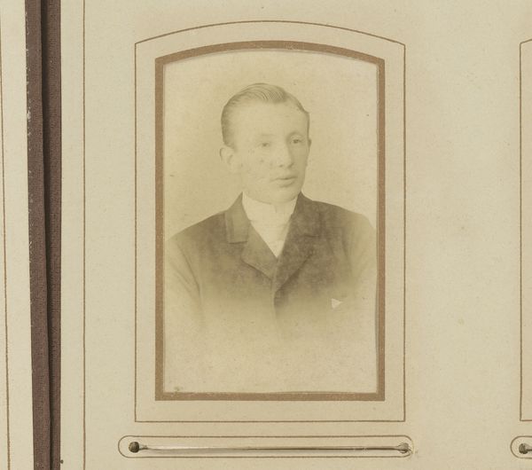 This is a portrait of an unknown young man, created by Wilhelm Benque in the late 19th century, using photographic techniques. The photograph is structured within a symmetrical composition; the sitter is centrally placed and framed by a soft, circular vignette, which contrasts with the sharp rectangular edges of the card. The limited tonal range emphasizes form and texture over color, drawing our attention to the subtle gradations of light and shadow that define the subject's features and clothing. Consider how the artist manipulates the focus and depth of field to isolate the figure from the background, creating a sense of intimacy. The semiotic weight of such formal choices highlights the cultural codes of portraiture at the time. In essence, the photograph embodies a tension between revealing and concealing, inviting us to contemplate the silent narratives embedded within its formal construction.
