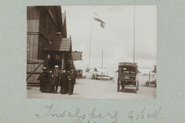 Editor: So this photograph, "Auto en een voetganger op een weg temidden van water in een buitenwijk van Parijs," was taken by G. Dangereux sometime between 1910 and 1911. The sepia tone and flooded landscape give it such a melancholic feeling. What strikes you most about this image? Curator: The flooding itself becomes symbolic, doesn’t it? It washes away the established order, turning familiar spaces into something almost mythical, a waterworld re-imagining of Parisian suburbs. Notice the power lines still standing. How do those modern elements work alongside this image of natural disaster? Editor: I hadn't thought of that. They create such a stark contrast. Are they meant to convey resilience against natural disaster, or futility against its unbridled force? Curator: Perhaps both. Power lines could signify modern advancements attempting to tame the untamable aspects of nature. This reminds me of the romantic era's fascination with ruins. We look at it now with different lenses as modern witnesses to increasingly frequent deluges, not as passive observers. What memory is this scene summoning up for the modern viewer? Editor: You’re right. Today, these kinds of images trigger immediate anxieties about climate change. Thinking about it that way changes the whole mood. It's less historical, more urgent. Curator: Precisely. This photograph becomes a carrier, an encoding device holding cultural memories, fears, and perhaps, a call for action, embedded in what seems to be a landscape captured in stillness. Editor: I see this photograph with a new urgency now. It shows so much more than just a flood from over a century ago.