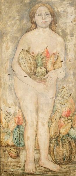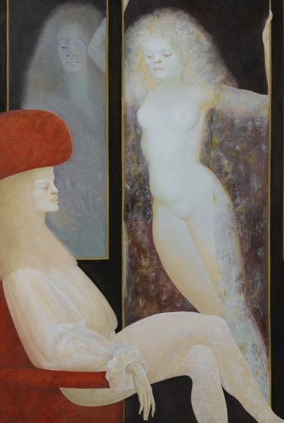Curator: Gerda Wegener's "Springtime," painted in 1938, greets us with a fascinating, almost dreamlike image rendered in oil. Editor: It's incredibly delicate! The palette feels restrained, almost pastel, lending the whole composition a gossamer, ethereal quality. Curator: Ethereal, yes. Look closer at the woman. Butterflies often symbolize transformation and rebirth, appropriate for Springtime. And what about the figure of Cupid just behind? It echoes classical portrayals of beauty and desire. Editor: Semiotically, the juxtaposition certainly reads as a playful nod to desire awakening within the individual, or even the soul's transformation in springtime. Structurally, Wegener uses the hazy mountainous backdrop to flatten space, creating this fascinating interplay between foregrounded figure and almost ornamental background. Curator: Do you feel the Art Nouveau influence here? It has such a rich interplay of fin-de-siècle aesthetic, exploring complex narratives around identity and perhaps reflecting Wegener's personal story during a period of evolving gender identities and social changes. Editor: Definitely. Notice how Wegener renders flesh, almost as luminous porcelain? And yet, there’s something deliberately ambiguous about the application of paint, softening the forms and imbuing them with androgyny. The surface texture suggests something slightly ‘off,’ a constructed rather than wholly natural reality. Curator: The intentional artifice invites us to look past mere physical representation, hinting toward layers of meaning beneath a seemingly simple, pleasant composition. The nude in art is an iconic trope that here acts more as a psychological manifestation. Editor: Absolutely, and this allows us to further unravel this symbolic language. By manipulating colour, line, and form, Wegener prompts us to engage in the cultural implications of transformation and what it represents about self. Curator: Examining the rich symbolic framework, and how it merges the physical world and psychological depths. Editor: Precisely; I now see it not only as aesthetically refined but conceptually multilayered.