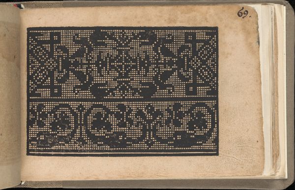 Curator: This is a page from the "Schön newes Modelbuch," a book of model designs created in 1608 by Sigismundus Latomus. The artwork is a woodcut printed on paper, currently held in the collection of the Metropolitan Museum of Art. Editor: Ah, it has this beautifully austere quality. Stark geometric forms rendered in monochrome evoke both precision and this rather pleasing rusticity... Curator: Indeed, the linework is meticulously structured; the composition establishes a strict adherence to symmetry, featuring dense interweaving of linear elements to create complex patterns and geometric figures. Note how the artist organizes space using the contrast between positive and negative shapes. Editor: There's something both very rigid and surprisingly organic happening here; like formalized botany rendered on graph paper, constrained, cultivated. Were these motifs common then? Curator: Pattern books like this served as indispensable tools for artisans—embroiderers, lacemakers, and other textile workers. These offered a source of inspiration, instruction in decorative techniques, enabling the widespread dissemination of artistic styles across Europe. The use of geometric patterns provided the basis of many needlework designs during this era. Editor: I’m imagining nimble fingers painstakingly recreating this. It has this very homespun feel but is somehow meticulously organized and reproduced. It speaks to domesticity but also something grander like commerce, ingenuity, innovation in the textile trade, all neatly bound up. Curator: It demonstrates how art and design intersect in the everyday. Latomus masterfully uses line and shape. He is showcasing how design moved in early modern life, how these repeating geometric patterns have a kind of internal logic all their own. Editor: Precisely! It reminds us of the human desire to order and beautify our surroundings. It’s just one page but seems to capture a world and the creative processes of the time. It feels incredibly current!