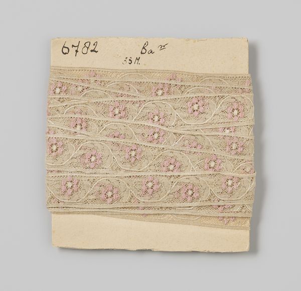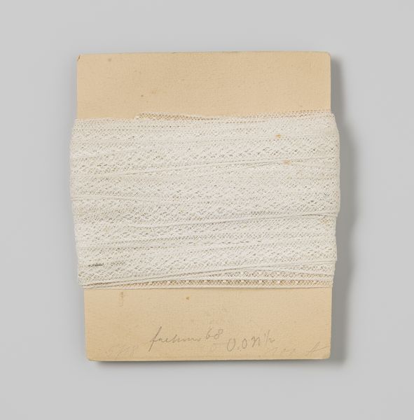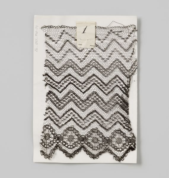 Curator: Looking at "Tussenzetsel van witte kant met golvende lijn," created around 1920, one is struck by its quiet elegance. As a piece of decorative art, it holds an intriguing position. What's your first impression? Editor: There's a delicacy, almost a whisper, to the lace. The repeating geometric patterns create a mesmerizing visual rhythm, and the color evokes a sense of purity and refinement. Curator: Lace, historically, isn’t merely decorative. Its production was intensely gendered labor—entire communities of women dedicated their lives to its creation, impacting economic and social structures. It’s a potent symbol of femininity, labor, and class. Editor: The construction itself speaks volumes. Look at the meticulous arrangement of threads, forming this intricate structure that transcends its function. It reminds me of classical ideals of harmony and proportion. Curator: Exactly. The level of detail suggests hours of meticulous work, likely within highly constrained conditions. Moreover, lace's role in adorning clothing signified status and power. Considering this piece, did it reinforce or subvert social hierarchies of the time? Editor: It does have an understated sophistication, but it invites closer inspection, revealing layers of detail. I see how this meticulous structure might represent an ordered world, built from delicate, interconnected parts. Curator: Considering that many lace-making communities suffered economic hardships during this era, this piece gains even greater weight. The beautiful hides complex realities of survival. Editor: Analyzing just its pure visual aspects, it is remarkable to appreciate the geometric repetitions of waves, juxtaposed to those almost pixelated details on the band that features the textile. The structural integrity emerges as the primary carrier of artistic significance here. Curator: Your point illustrates the interesting paradox within art like this. Formally, the elegance is undeniable, yet it obscures the struggles that went into its production, complicating its visual beauty. Editor: Perhaps that inherent duality – its elegance masking complex realities – contributes to its enduring appeal, sparking conversation across history, technique, and context. Curator: Precisely. We must continue to investigate the layers and open dialogue between artistic value and the sociopolitical stories intertwined.