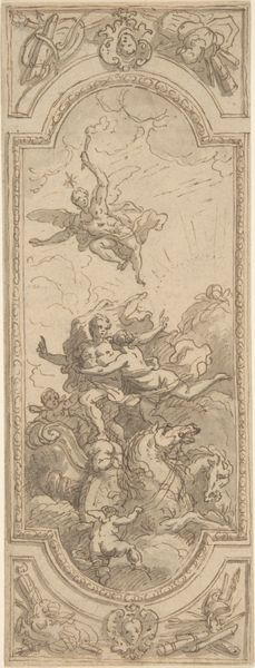 Curator: It's all cherubs and clouds, quite a confection! There's a buoyant energy to this small circular piece. Editor: Indeed. What we have here is "Apotheosis," created by Johann Georg Etgens sometime between 1710 and 1757. Etgens worked primarily with pen and ink to create these intricate drawings and prints. The piece you see before you utilizes ink on paper. Curator: The use of ink, particularly in drawings like this, always interests me. Consider the accessibility of the material itself—the means of production are so simple, a quill and some pigment mixed with water, yet the outcome is so meticulously rendered. It feels almost democratic in its approach to art-making, wouldn't you say? Editor: In a sense, yes. Though remember that access to quality materials, even seemingly simple ones like paper and ink, were dictated by social structures and patronage. Etgens was working within the Baroque period, an era known for its spectacle, grandiosity and allegorical subject matter. How does this drawing reflect such ideals, do you think? Curator: It seems that this "Apotheosis" shows figures rising to a sort of godliness or deification through the use of ethereal materials: clouds. There are clusters of cherubs with light feathery strokes forming a soft base of cloud-like mass, allowing these figures to literally rise up above and beyond the average. It's very visually persuasive. The swirling lines pull the viewer's eye upward. Editor: Right, this notion of "rising above" aligns with Baroque art's public role in reinforcing power, be it religious or secular. The art served to inspire awe, reinforcing social hierarchies and religious authority. Consider, too, the cultural and institutional role this type of idealized imagery played, shaping perceptions of nobility and divinity. Who *are* the noble, elevated figures though, here? It isn't perfectly clear. Curator: True, we can also appreciate this for its mark-making—how those varying ink washes create a sense of depth, and how Etgens transforms humble materials into an artwork of great dynamism. What really stands out is the craft, regardless of any social implications it reflects. Editor: A productive tension, I think. Analyzing "Apotheosis" through both its materials and its socio-political underpinnings offers a fuller understanding, don't you think? It allows us to reflect on art's function then and our interpretation now.