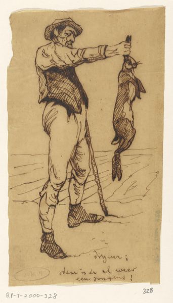 Johannes Tavenraat made this drawing of a man carrying a hare sometime in the mid-19th century. Its elemental quality is inseparable from the medium itself: graphite on paper. The artist coaxes a remarkable amount of detail from this humble material, the soft gray tones rendered by the pencil create a hazy atmosphere. You can almost feel the chill in the air. The choice of this medium is important, it's a means of production that is immediate and accessible, and perhaps the artist wanted to create an affinity with the hunter that is the subject. The economy of line captures the weight of the man’s labor, emphasized by the dead animals at his feet. Here, the making—the act of drawing—becomes a form of social commentary. This isn't just a picture, it's a record of work, of a life lived close to the land. It reminds us that art can be found not only in grand statements, but also in the quiet observation of everyday life.