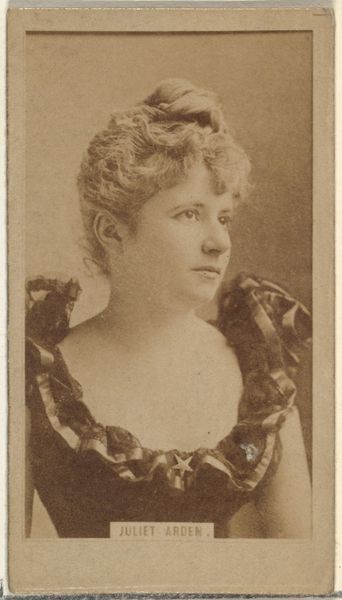 Curator: A slightly faded photograph. Grace Stewart, a woman gazing thoughtfully towards some distant ideal. Editor: She's so regal! Despite the softness of the sepia tone, her profile has a kind of sharp elegance. And there’s such confident precision to the lighting and arrangement; the artist carefully crafted its overall formal appearance. Curator: Indeed. This is one from Allen & Ginter's "Actors and Actresses" series, part of the N45 collection printed as trade cards for Virginia Brights Cigarettes around 1885-1891. Editor: It’s the perfect artifact: popular portraiture married with marketing. She almost seems like an allegorical figure in cigarette form. Curator: Consider her ornamentation. The headband is distinctly Greco-Roman in style, reminiscent of laurel wreaths symbolizing achievement and status. Then, the necklace: a strand of discs echoing ancient coins perhaps, further grounding her image within a classical aesthetic of poise and leadership. The layers add resonance to her gaze, speaking of an aspiration or quest for excellence. Editor: Look closely; see how each object reinforces an implicit visual system. This network implies that value exists within the structure, linking advertising, artistry, and even classical allusion. Curator: Yes, a visual tapestry of association! Though distributed as everyday ephemera, Allen & Ginter clearly infused cultural memory, associating the consumption of their brand with historical concepts of grandeur. By including her name at the bottom of the image, it also transforms her—Grace Stewart, the actress—into an idea and symbol. Editor: Right. Now, I appreciate the portrait's conceptual weight through formal understanding—and its visual construction—much more fully. Thanks! Curator: And now, I too appreciate how art finds its function in commercial culture through studied construction. These historical touchstones change my view.