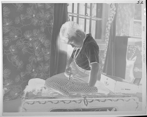 Editor: This photograph by Lucian and Mary Brown, titled "Untitled (boy with model boats)," captures a young boy engrossed in what appears to be instructions for building model boats. The photograph's composition is intriguing with a focus on the objects of production as much as the boy himself. What can we interpret from the materials present in this image? Curator: Consider the labor involved in model boat construction. The materials themselves – wood, glue, paint – speak to a specific type of craft and a certain level of skill. The consumption of these materials and the finished product highlight the intersection of hobby, industry, and social class. Editor: So, you’re suggesting we look beyond the sentimental image of a boy with his hobby and consider the broader economic and social implications? Curator: Precisely. What does the act of building and displaying these model boats say about leisure, aspiration, and the cultural values attached to maritime history or even naval power? Editor: That’s a perspective I hadn’t considered. It makes me think about how even seemingly innocent hobbies are tied to larger material and social realities. Curator: Exactly. Analyzing the materials and the process opens up a whole new layer of understanding.