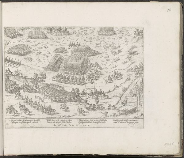 Editor: Here we have Frans Hogenberg's engraving, "Slag bij Dreux, derde treffen, 1562", placing us somewhere between 1565 and 1573 when it was created. It’s at the Rijksmuseum, and frankly, it's chaos! There's just so much happening, so many tiny figures… It feels almost like looking at a map. What story do you think Hogenberg is trying to tell here? Curator: Ah, chaos organized! I see Hogenberg wrestling with perspective itself, like a painter grappling with the divine. It’s a bird's-eye view, yet intimately detailed. The soldiers are arranged as in a geometric garden, violence made elegant, horrifying beauty... What does that juxtaposition evoke for you? Editor: I guess it makes me think about how war is often glorified, turned into spectacle… the reality being so different. Curator: Exactly! He captures a pivotal moment of the French Wars of Religion, domestic conflict turned picturesque. It is Mannerist in style – an almost artificial harmony overlaying a bloody scene. And that windmill...a seemingly neutral bystander in a drama filled with complex motivations and stark moral quandaries, the turning point that may alter destinies. Do you see other symbols hidden within this organised confusion? Editor: I hadn’t noticed that before, but looking closer I do now. I’m noticing things I hadn’t on first viewing of it, details are starting to become clear Curator: It is that clarity emerging from chaos which resonates, something that rewards patient and meditative viewing. Editor: This was definitely a meditative journey and eye-opener. Thank you.