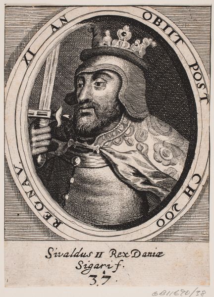 This is an engraving of Halfdan Bjerggram, of unknown date and by an anonymous artist. The portrait, dominated by linear precision, presents a figure encased in armor, encircled by an oval frame inscribed with Latin text. The use of hatching and cross-hatching is particularly striking, creating tonal variations that give volume to the figure. Notice how this technique is especially evident in the rendering of the armor, where the density of the lines suggests the play of light on the metallic surface. This emphasis on texture and material is key to understanding the print. The semiotic value is in the details: the crown, the armor, and the orb held in his hand, each element conveying status and power. The Latin inscription, framing the portrait, functions as a linguistic signifier, anchoring the visual representation to a historical and cultural context. The formal structure of the portrait, therefore, is not merely decorative but deeply enmeshed with systems of meaning and representation, inviting us to consider the interplay between visual form and cultural codes.