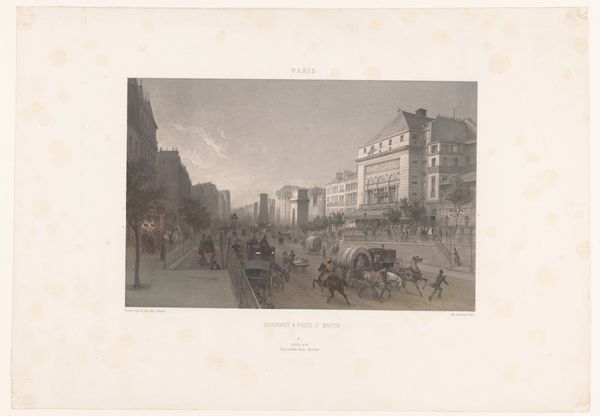This is Philippe Benoist's 'Zicht op de Porte Saint-Denis,' an artwork of unknown date, held at the Rijksmuseum. Executed with a refined lithographic technique, the print presents a compelling urban vista dominated by the imposing Porte Saint-Denis. The composition employs a structured recession into depth, guiding the viewer's eye along the thoroughfare towards the arch. Benoist meticulously balances architectural precision with atmospheric nuance. Notice how the symmetry of the arch is echoed by the buildings lining the streets, creating a rhythmic visual pattern. The print engages with semiotic systems of urban representation common at the time. The arch, a historical monument, signifies power and continuity, while the bustling street suggests the dynamism of modern life. The print is less about capturing a specific moment and more about encoding cultural values and historical narratives within a visual framework. Consider how the formal elements, the lines and spatial arrangement, converge to not only represent a physical space but also to articulate a particular vision of Paris, caught between its past and future.