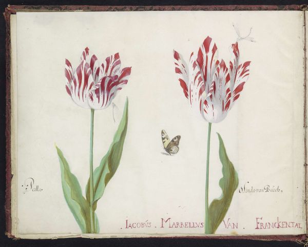 Jacob Marrel made this watercolour and gouache painting called 'Two Tulips with a Butterfly', part of a series of botanical illustrations, most likely sometime in the 17th century. Marrel was German but spent significant time in the Netherlands, and this work captures the feverish obsession with tulips that gripped Dutch society in what is now known as "Tulip Mania." During this brief period, single bulbs of rare varieties commanded exorbitant prices, exceeding the cost of houses or even entire estates. Paintings like this served as both scientific records and luxury items, commissioned by wealthy collectors eager to document and display their prized possessions. The meticulous detail and vibrant colours reflect not only the beauty of the flowers but also the social and economic forces that elevated them to objects of immense value. To understand this image fully, one can consult the detailed records of Dutch auction houses and the inventories of collectors that tell us so much about the economic history of the period.