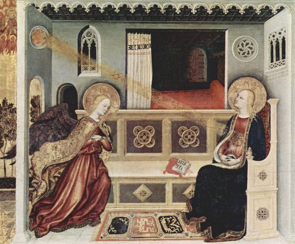 Curator: Masolino da Panicale, an early Renaissance artist, created this tempera painting, "The Annunciation," around 1423-1424. What are your first impressions? Editor: The sheer formality strikes me immediately. There's an almost rigid structure in the composition, defined by the architectural elements, despite the soft hues. The space feels meticulously divided. Curator: Yes, that controlled space certainly enhances the symbolism. The setting—an elaborate chamber—is rich with visual cues. The column splitting the space is interesting. Does it represent the separation between the earthly and the divine? Editor: Precisely! That division emphasizes the conceptual separation, a very Renaissance exploration of pictorial space influenced by classical structures. The contrasting geometric patterns in the background clash intriguingly with the soft drapery. It’s like two styles fighting for dominance. Curator: Those geometric motifs—the checkerboard ceiling, for example—they suggest an ordered cosmos, reflecting a theological understanding of the world, wouldn't you agree? And the radiant light pouring in… that symbolizes divine grace, illuminating Mary. It brings such an impactful symbolic weight to the piece. Editor: I see that, certainly. It almost functions as a visual ray tracing in a game engine – it's incredibly precise and renders Mary as the point of intersection. I wonder about the figures themselves, specifically the choice of the color on their garments? Curator: Mary's blue mantle immediately connects her to the traditional iconography of the Madonna, evoking associations with purity and royalty. The angel Gabriel’s rich brocade… that signals his divine status, linking him to earthly kings and prelates, perhaps? It’s like a vocabulary lesson written in colors. Editor: An interesting connection, and one the eye is keen to make. Still, focusing back on the formal aspects, one can see that even though it feels symmetrical, a delicate asymmetry defines the relationship between the characters and therefore their roles in the painting. It is quite subtle, yet so well achieved, if you look at the curvature of the arch behind each character… Curator: What an astute observation! That deliberate imbalance creates visual tension. In closing, I'd say this “Annunciation” isn’t just a biblical scene; it's a tapestry woven with faith, power, and the visual language of the time. Editor: I completely agree; and by emphasizing compositional structure, color relationships, and calculated uses of perspective, it allows for deeper semiotic reading.