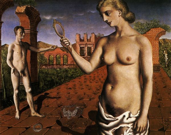 Editor: Paul Delvaux's "Night Visit," painted in 1938 using oil paint, has a dreamlike quality. The composition feels almost staged, with the figures seeming frozen in time. How do you interpret this work, especially its depiction of the female form and the overall unsettling atmosphere? Curator: The "Night Visit," situated within the surrealist movement, certainly unsettles. Delvaux’s figures, particularly the female nudes, are indeed staged, presented almost as mannequins. What happens when we view them not just as objects, but as stand-ins for a suppressed collective feminine consciousness emerging during a period marked by extreme social and political upheaval? Considering Delvaux's own historical context and the rise of oppressive regimes in Europe, might this painting function as a subtle form of resistance? Editor: That's fascinating. I hadn't considered the figures as potential symbols of resistance. The almost ritualistic offering of the cup by the figure in white could be interpreted as some kind of call to action, then. Curator: Precisely. And how does this interaction challenge conventional representations of women within art history? Are we seeing a reclaiming of agency, where the nude form becomes a vessel for something more than passive beauty? Delvaux isn’t just painting nudes, he’s crafting a visual language rooted in dreamscapes to articulate subconscious anxieties and desires of the time. He’s putting forward uncomfortable conversations around social and political repression. Editor: So, it’s less about the male gaze, and more about a potential for self-discovery and empowerment of the collective feminine voice, however muted? Curator: Exactly. It’s about dismantling traditional power dynamics within the art historical canon and broader society. What have you taken away from our conversation? Editor: I now recognize a deeper dialogue that transcends mere representation, viewing it instead as a canvas for a feminist discourse! Curator: Indeed, the canvas then turns into a conduit for social commentary and change.