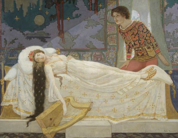 Curator: This powerful oil painting by José Garnelo is titled "La Muerte de Lucano," or "The Death of Lucan" and it captures a pivotal moment in history. I’m immediately struck by the stillness contrasted with the obvious distress of the figures surrounding the central figure. Editor: The starkness of the room, the paleness of Lucan’s body against the rich colours worn by those who watch, evokes a visceral feeling of mourning. It's impossible to ignore the very real, very human consequences of power represented here. Who exactly was Lucan, and what socio-political narrative is at play here? Curator: Lucan was a Roman poet, forced to commit suicide after being implicated in a plot against Nero. This scene portrays his death, surrounded by loved ones as he bleeds out in a bath, a common method of suicide in Roman times. What I find so remarkable about the piece is its engagement with Stoicism, but simultaneously grappling with ideas around self-sacrifice in light of tyranny. Editor: Absolutely. Garnelo is deliberately inviting us to question state power and to interrogate how individual freedom plays against perceived acts of treachery, but even beyond those concerns, he compels viewers to explore more existential dilemmas around honour, life, and death in a tumultuous political landscape. Curator: Yes, and I think situating this artwork within the context of late 19th-century Europe—with its own socio-political upheavals—allows us to draw important parallels between antiquity and modernity, exploring concepts of censorship and state violence that have modern corollaries. Editor: The brushwork feels very deliberate, and creates a cinematic feel – all the characters surrounding the deceased Lucan feel caught mid-motion; some lamenting while others express disbelief or shock. It is a moment that we, the viewer, have the privilege of pausing, making Lucan's death less a spectacle and more an intimate contemplation. Curator: What strikes me now is that despite its seemingly detached subject matter—a historical event— the scene continues to resonate. Ultimately, “La Muerte de Lucano” pushes us to consider the precarious balance between the power of art, politics, and individual freedom. Editor: Precisely, and this piece, for me, transcends its historical context, forcing a reckoning with those enduring and often painful human values which continue to resonate with society and institutions to this day.