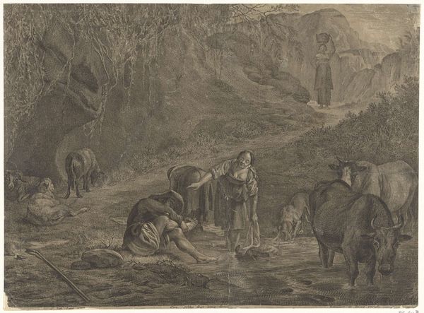 Curator: Welcome. Before us is a drawing by Friedrich Wilhelm Hirt titled, "Ziegenherde mit einem Hund, hinter einem Felsblock eine alte Hirtin mit einem Kind," held here at the Städel Museum. It depicts a goat herd, dog, and shepherd family set against a stark landscape, rendered in ink. Editor: My initial impression is one of quiet toil, almost mundane. The use of line is stark. Curator: Indeed, the composition strikes me through the arrangement of forms. The angularity of the rocks is counterpointed by the curvaceous forms of the goats and figures, generating a rhythm between hard and soft that sustains visual interest, even though the rendering appears quite rapid. Semiotically, one could read the receding background and high horizon line as a means of creating distance, perhaps indicative of isolation. Editor: I'm drawn more to the material processes at work here. You sense the artist quickly capturing a scene—presumably en plein air—trying to translate observations directly onto paper. It raises questions about Hirt's relationship with the pastoral labor he represents. Was it experienced first-hand, or seen through a distant, perhaps romantic, lens? The simplicity is revealing, highlighting the very basic elements of their material life. Curator: But let's not ignore the nuances in the ink work. See the light hatching on the goats which defines their form; or the varying line weights that distinguish the figures in the background? These elements create a certain atmospheric perspective. Editor: Precisely, and in that contrast lies the tension between romanticized representation and a potentially harsher reality. Consider the dog in the foreground. How involved was this sketch in the making of this scene? How would it play a role to these laborers day-to-day life? How much labour goes into the herding versus how little labour seemingly went into the production of this work, given the lack of cross-hatching and value? It begs a reading of the entire composition and artistic context that avoids idealizing country life and engages in the tangible concerns and working conditions. Curator: I concede to that. Analyzing Hirt’s approach illuminates the power of these elemental components. By examining them independently, and jointly, one unveils deeper thematic layers beyond the apparent pastoral idyll. Editor: And it encourages us to consider the artwork not just as a formal arrangement but as a record, capturing the dialogue between human labour, animal utility, and artistic practice. A vital convergence, isn't it?