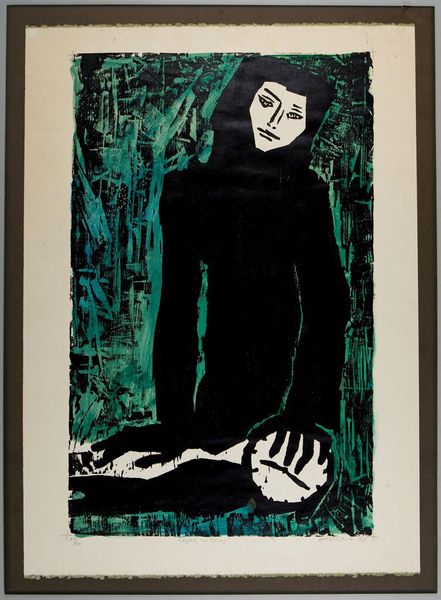 Editor: This is "Dream" by Kaoru Kawano, a woodcut print from 1950. I’m immediately struck by its bold red and black color palette, and how the face almost seems to fade into the background, despite being the focal point. How do you see this piece within the context of postwar Japanese printmaking? Curator: That's a keen observation. Looking at it through a historical lens, we can see "Dream" as part of the Sosaku-hanga movement, which emphasized the artist's complete control over the printmaking process. After the devastation of World War II, there was a surge in artistic expression reflecting a need for rebuilding cultural identity. Editor: So, how did social context inform this work? Curator: Think about the ukiyo-e tradition, the earlier woodblock prints depicting idealized versions of life. How does Kawano's work either challenge or build upon this tradition? Consider the figure’s introspective gaze, so different from the geishas or kabuki actors that dominate earlier prints. Also, notice that the intense colours serve as strong statements to symbolize resilience and strength in times of crisis. Do you notice the way the bold red envelops the figure? What meaning does that have in postwar society? Editor: I see what you mean, it almost creates a sense of protective armour around the individual, but there is an element of the subject trying to shield itself from reality. I suppose I had been focusing on its aesthetics and missing the historical background. I’m beginning to understand the shift towards self-reflection after such societal upheaval, thanks to your explanations. Curator: Precisely. And understanding this interplay between art and socio-political events deepens our appreciation, showing us that images carry complex stories and that public reception of art matters.