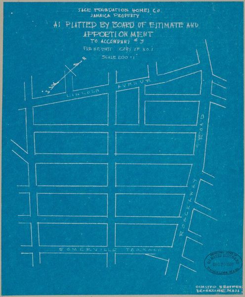 Curator: This blueprint, titled "Housing, Improved: United States. Massachusetts. Brookline. Jamaica Property: Sage Foundation Homes Company. Jamaica Property: Sketch for Subdivision with 28 Foot Streets," is attributed to the Olmsted Brothers. Editor: My first thought? A grid, a puzzle... It feels almost sterile in its precise geometry, like a city planned by someone who’s never actually lived in one. Curator: Absolutely. The grid structure reflects early 20th-century urban planning ideals, yet these designs often prioritized efficiency over community. Think about the social implications of these imposed layouts. Editor: Hmmm. The blue feels oddly hopeful though, a kind of clean slate. Maybe they really believed they could engineer a better life? Curator: It’s a tension, isn't it? This plan embodies both utopian aspirations and the constraints of top-down social engineering, reminding us that even with good intentions, design choices always carry ideological weight. Editor: It's a ghost of an idea, really. Curator: A compelling reminder of the relationship between urban design and social justice. Editor: Indeed, something to chew on.
